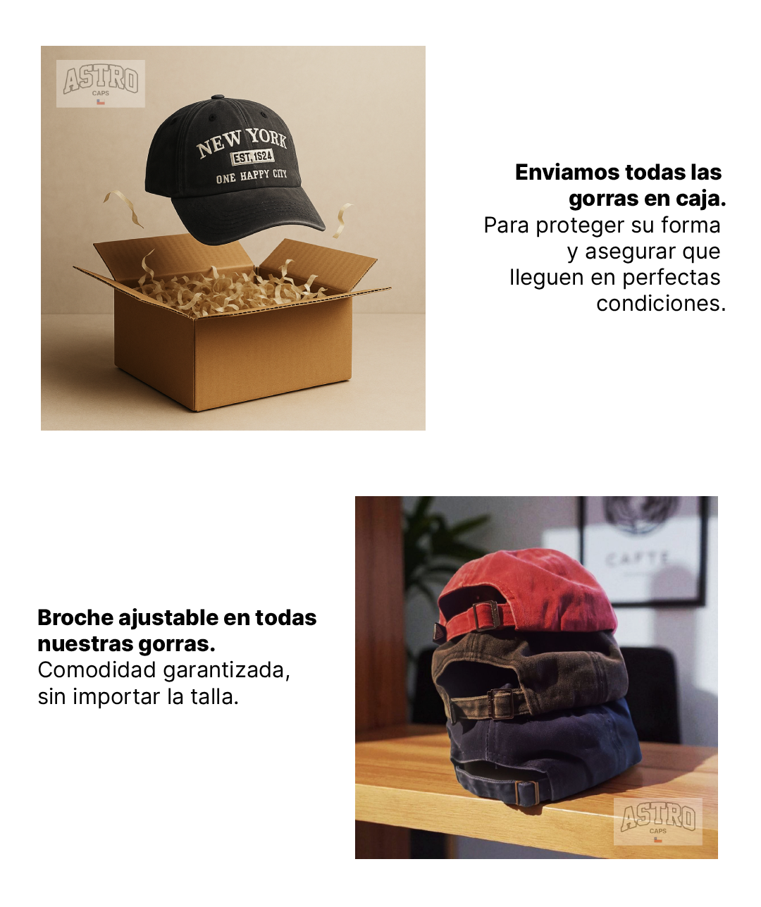 Todas nuestras gorras son ajustables, para que se adapten perfectamente a cualquier tamaño de cabeza. Solo tienes que regular la correa trasera y ¡listo!